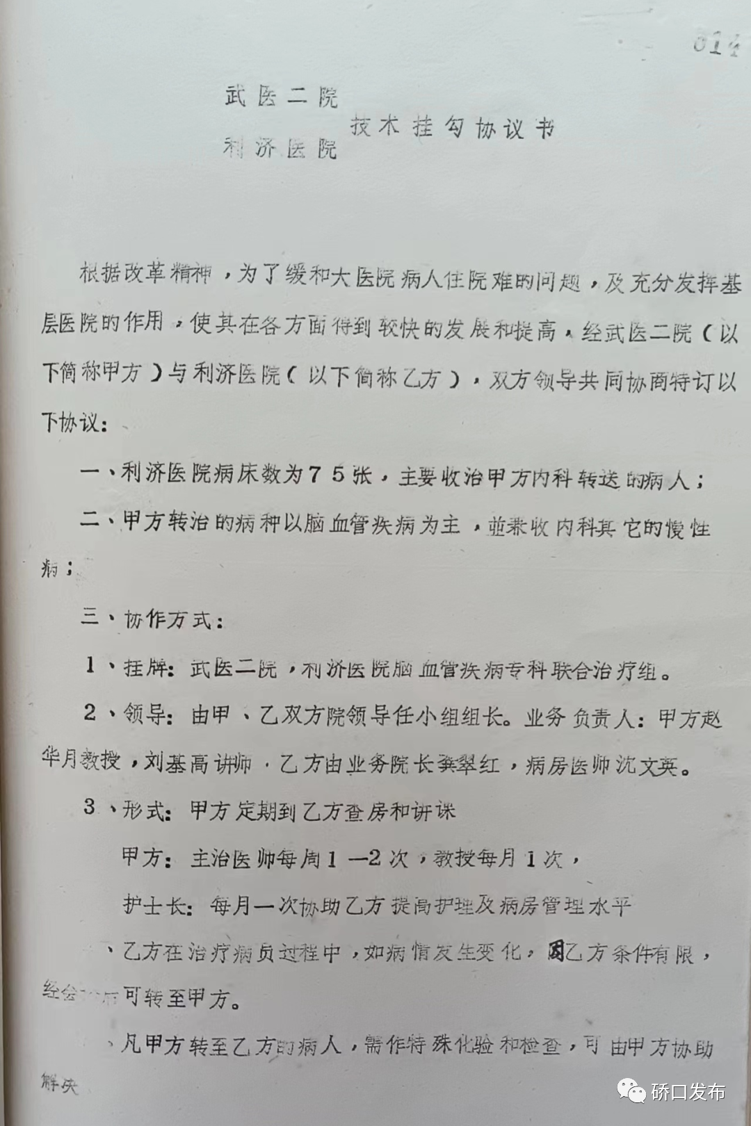 汉中人的诚心和闯劲,打动了武汉市第一医院。1983年3月,一份“大医院带小医院技术协议书”正式签订。经过上级主管部门批准,利济卫生院增挂“武汉市脑血管疾病医院”牌匾,成为武汉市第一家脑血管专科病房。