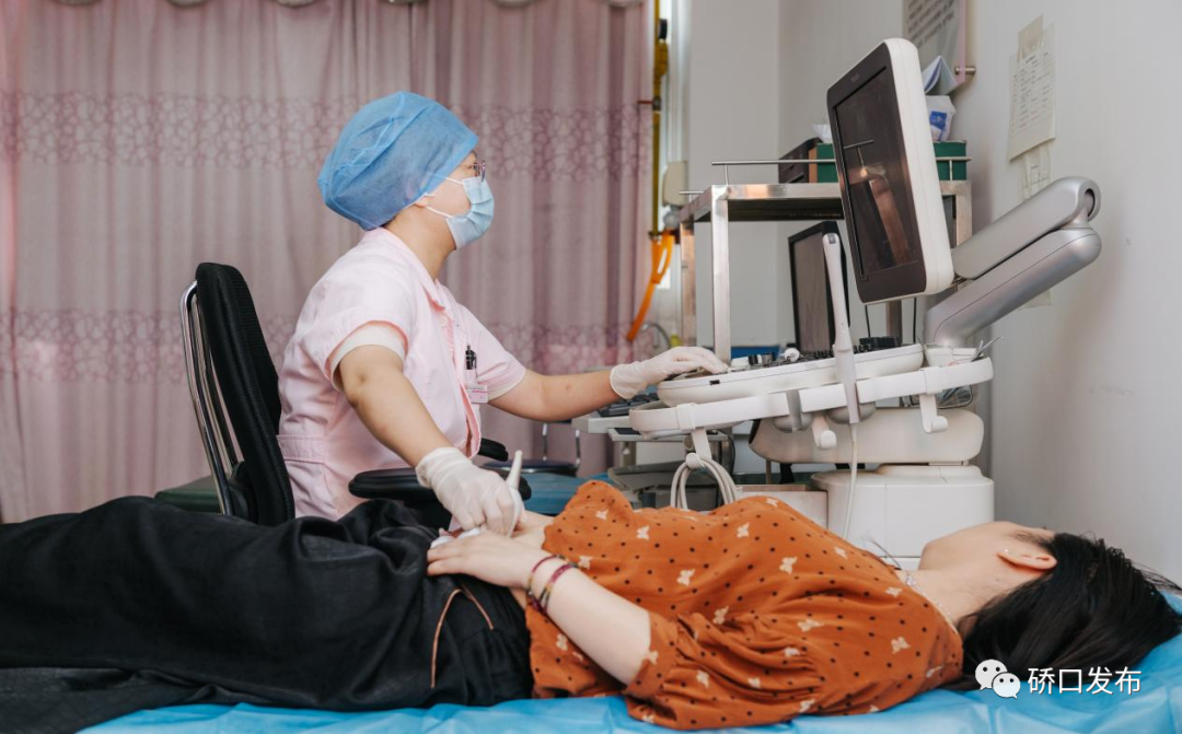 武汉市时代楷模、区妇幼保健院张芸医生为育龄期妇女进行子宫及双侧附件区超声检查。