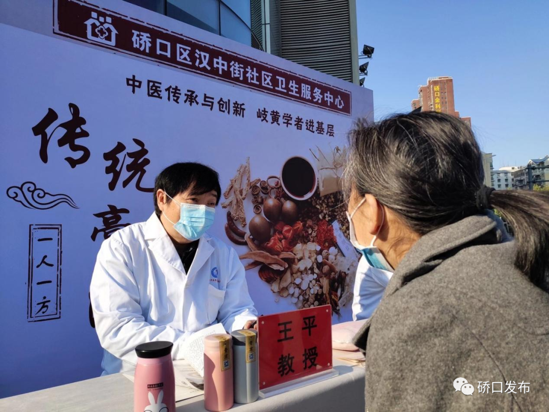 岐黄学者、湖北中医药大学副校长王平教授在硚口区中医药文化节活动中为居民进行义诊。