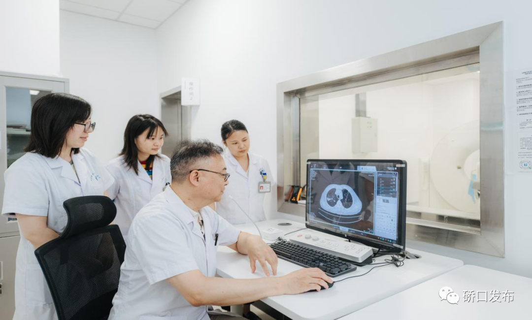 全国先进社区卫生工作者、汉正街社区卫生服务中心主任王昊带教青年职工,讲解分析CT检查结果。