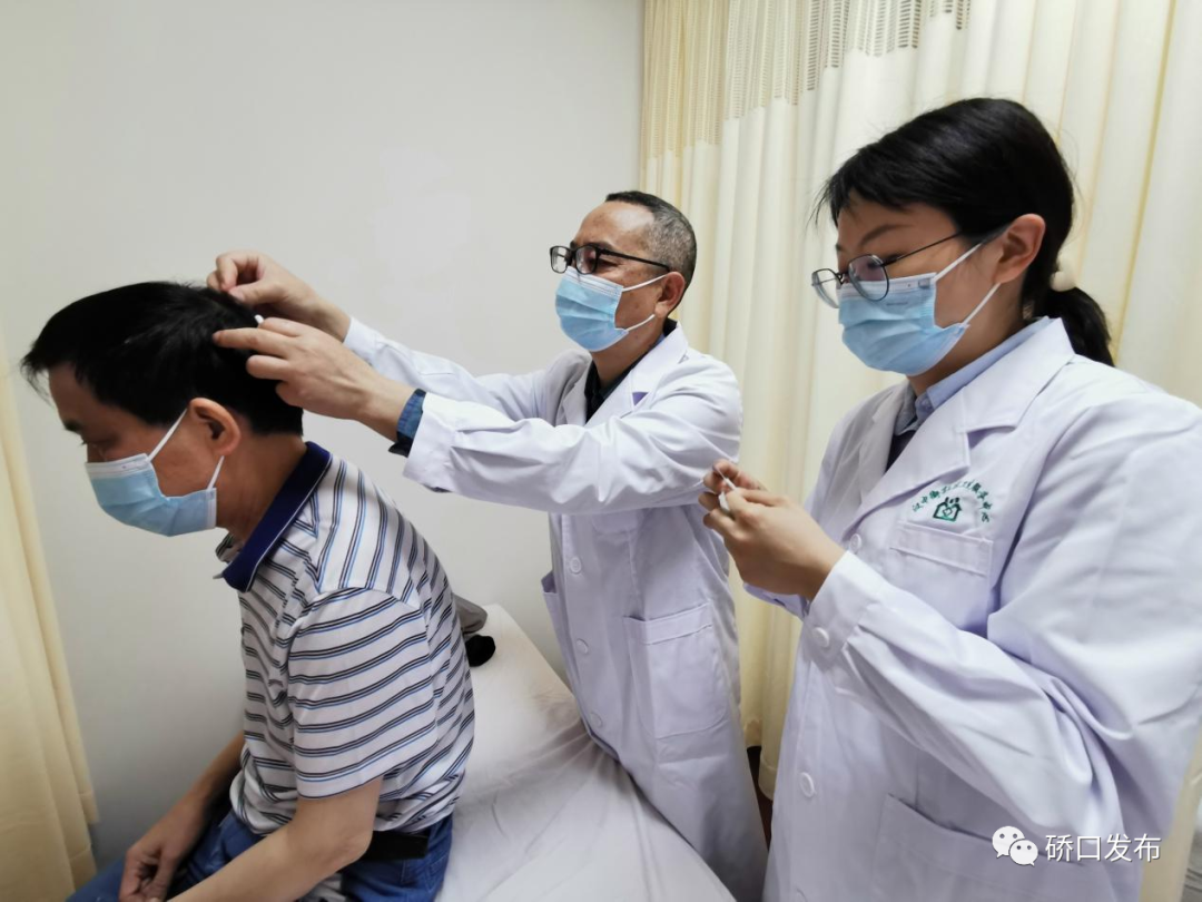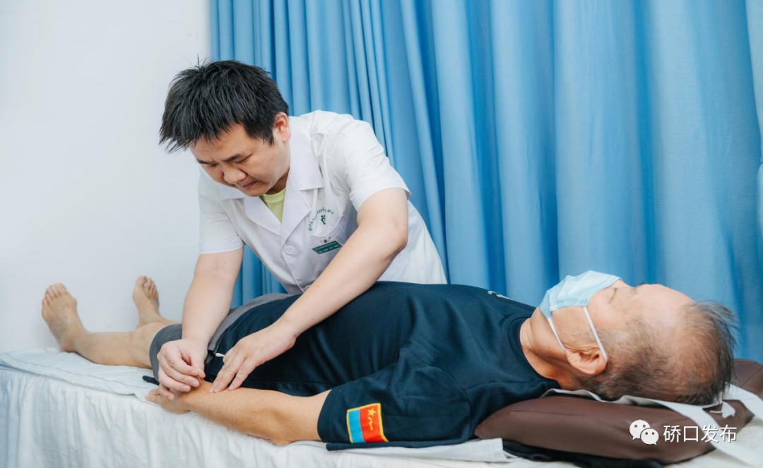 湖北中医药大学针灸骨伤学院院长彭锐教授在汉中街社区卫生服务中心为患者进行针灸治疗。
