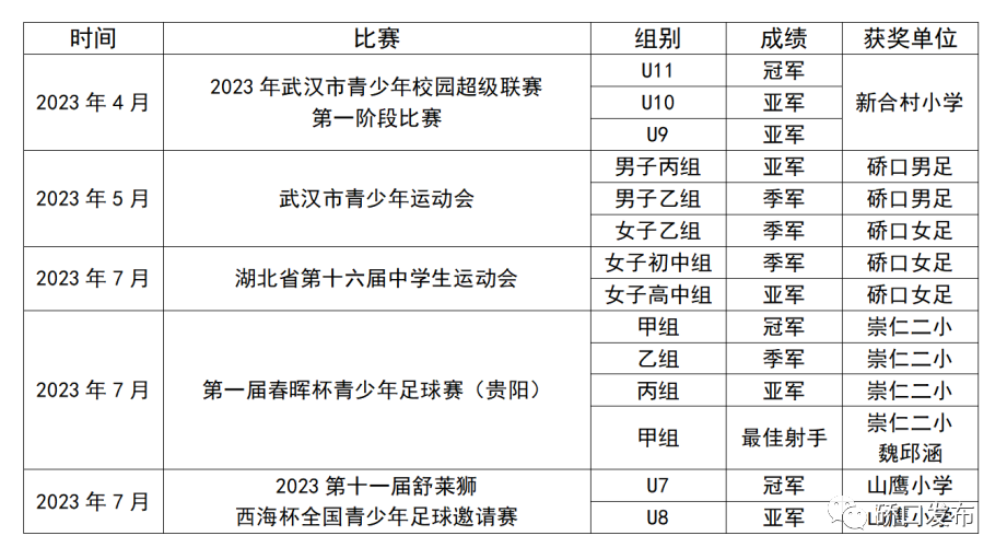 今年以来,硚口区各校园足球队参加了包括2023年武汉市青少年校园超级联赛、武汉市青少年运动会、湖北省第十六届中学生运动会、第一届春晖杯青少年足球赛、2023第十一届舒莱狮西海杯全国青少年足球邀请赛等在内的多场比赛,斩获多个奖项,赛果累累。