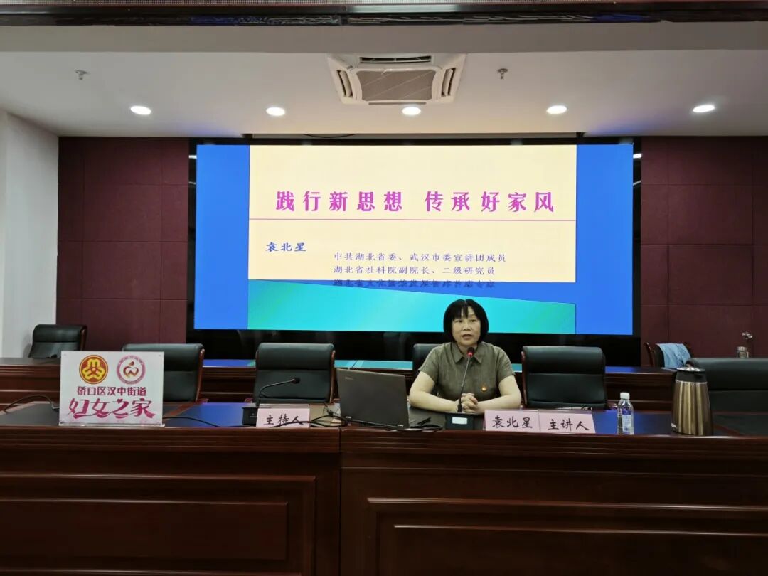 活动首先特邀中共湖北省委、武汉市委宣讲团成员、湖北省社科院副院长、二级研究员、湖北省文化繁荣发展智库首席专家袁北星教授做了“践行二十大新思想 传承优良好家风”主题清廉家庭教育讲座。袁教授结合深入学习贯彻党的二十大和习近平总书记关于家庭家教家风建设重要论述精神,从忠孝传家、道德传家、廉洁传家、诗书传家四个方面,对传承良好家风做了生动地诠释。特别是对树立正确的新时代家庭观,提倡爱家爱国相统一,让家庭教育帮助孩子扣好人生第一粒扣子,注重言传身教,让好家风代代相传做了重点阐述,受到与会人员一致好评。