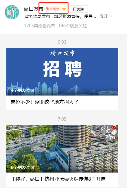 步骤二:进入“硚口发布”微信公众号,点击“直播中”,便可观看