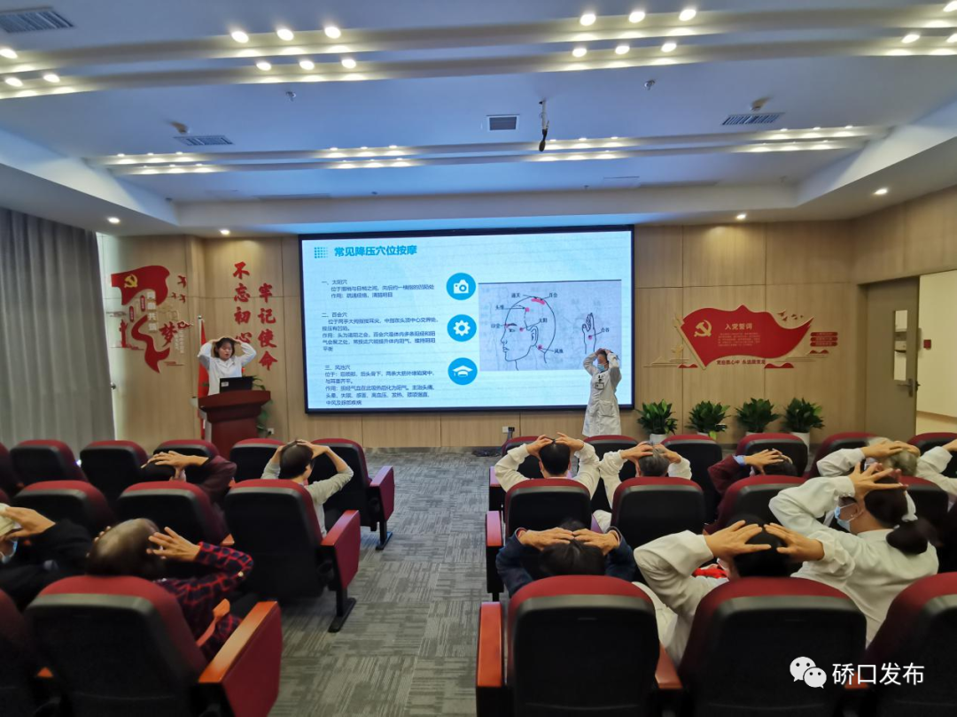 在汉正街社区卫生服务中心会议室里,“2023武汉市中医药文化宣传周·中医惠民惠老行动”之重阳讲堂开讲,全国百佳健康守门人、中国好医生、硚口家庭医生黄莹为老年居民介绍中医养生与慢性病防治小妙招,为老人送上中医药健康包。健康包里是黄莹精心配置的中药泡脚包、拍痧板,黄莹和中医师沈晓霞带着老人拿起拍痧板,拍肩膀,拍后背,疏通经络,耐心告诉老人如何泡脚。