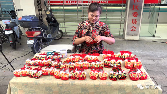 当日下午,营前社区的广场上晚霞映射,人头攒动,普通的泥巴、面粉在非遗大师的指间中流转,一个个人物、鸟兽、物品栩栩如生地出现在大家面前。古韵悠长的香囊、惟妙惟肖的剪纸、憨态十足的虎头鞋……色彩协调、明快醒目的非遗展品让小朋友们目不暇接、流连忘返。