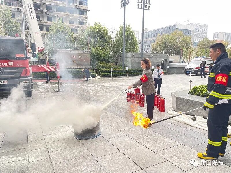 启动仪式上,全区调集3支消防救援力量、4支应急联动力量、6个部门联动力量,6台救援车辆、55名救援人员在恒隆广场举行超高层建筑灭火救援暨火灾事故应急预案联合演练,指挥员根据设定灾情下达作战指令,全体队员动作紧张,反应迅速,有序的展开战斗,圆满完成了此次演练工作。随后,汉正街消防救援站展示了战斗服、防蜂服等各种类型消防服装秀。