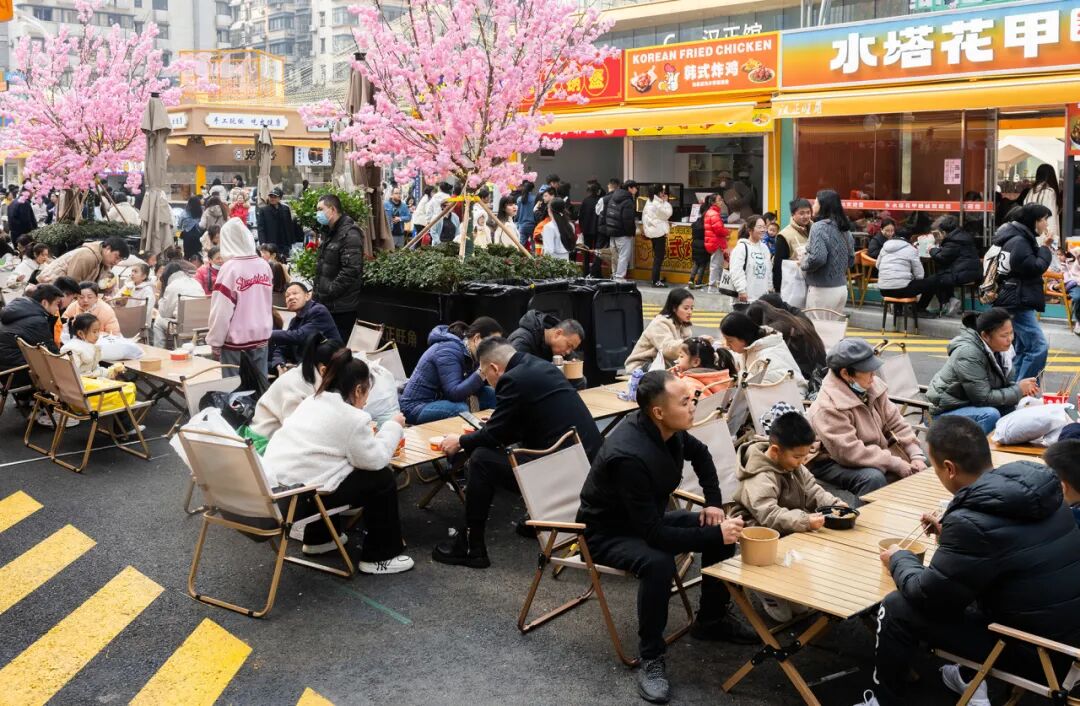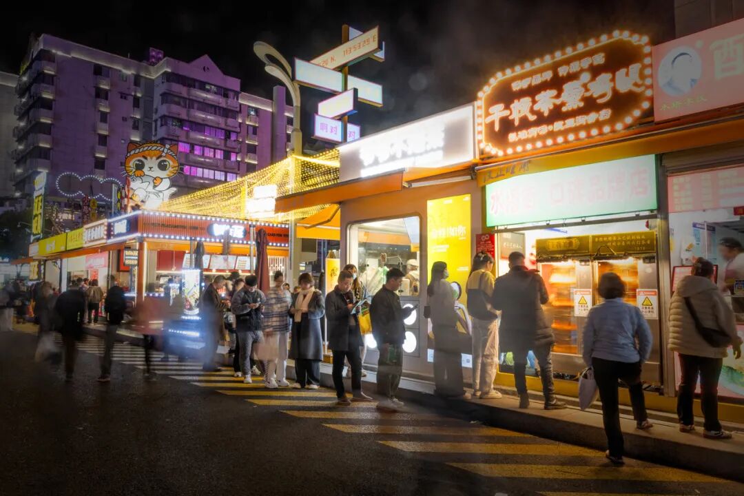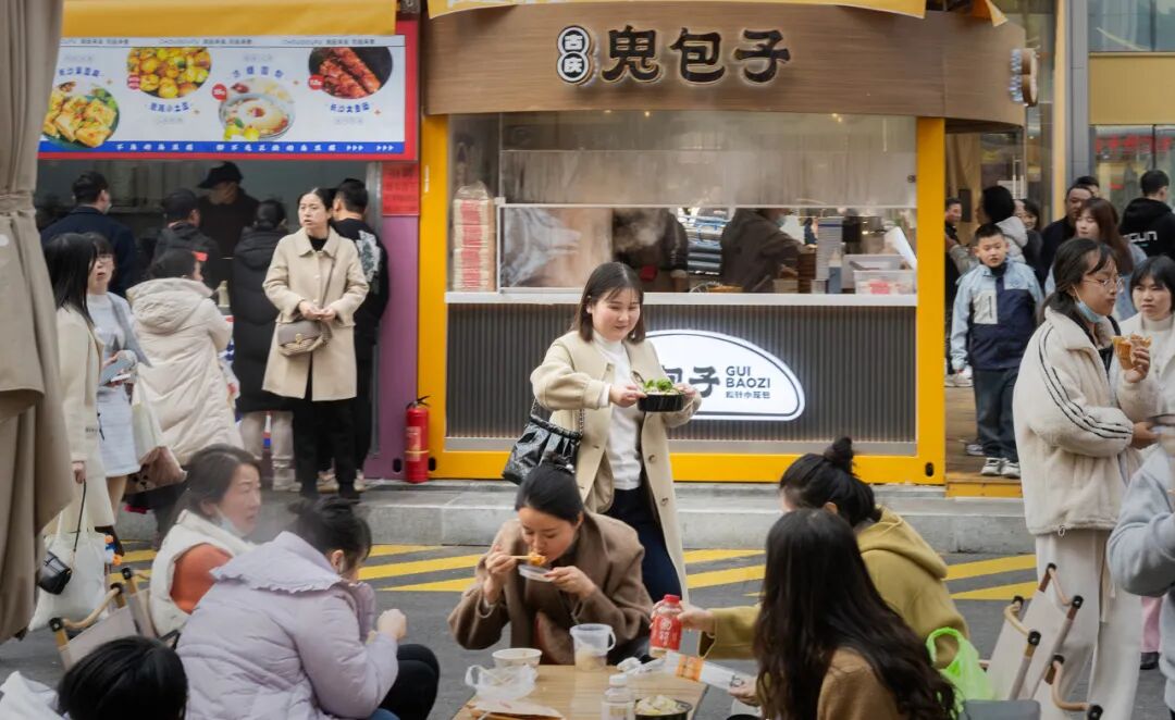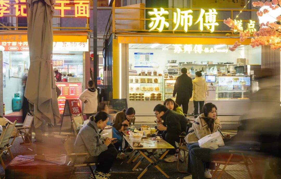 这里早已人声鼎沸,点一杯奶茶,吃一口汤包,来一串烧烤,空气中弥漫着各种美食的香味,时刻诱惑着人们的味蕾。店员们热情招呼,食客们谈笑风生,三五好友畅谈甚欢。