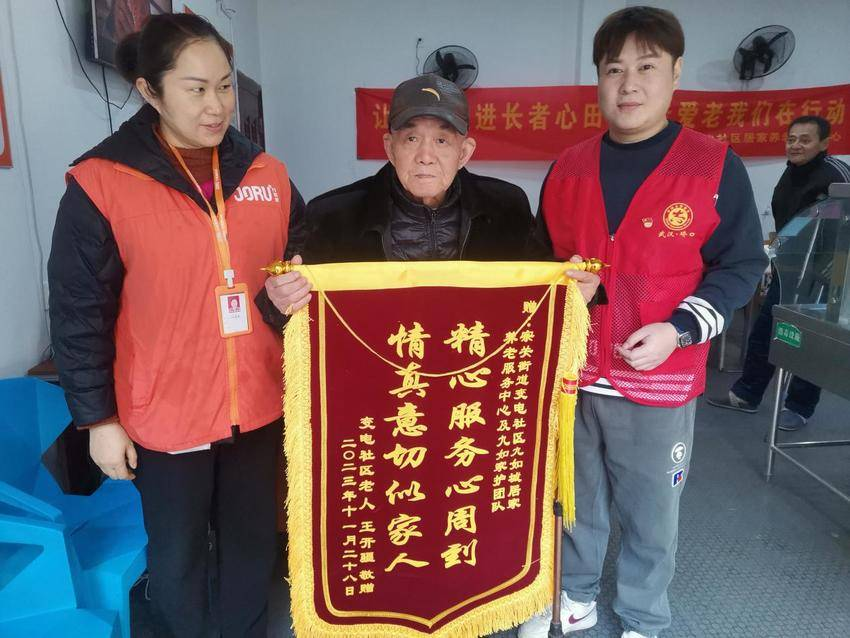 “感谢社区养老服务中心长期以来的关心关爱。”王开疆老人拿出了自己准备的锦旗感谢社区工作人员,他是一名89岁的高龄独居老人,由于自身腿脚不便,从幸福食堂开餐起,养老服务中心的工作人员就每天风雨无阻地上门送餐,令他感到温暖贴心。