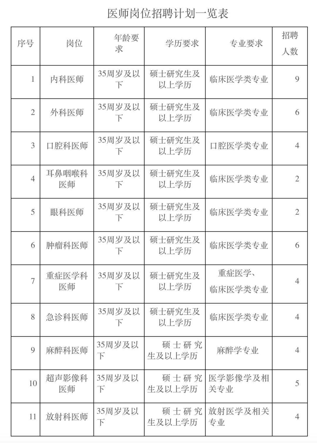 医师岗50名,含内科医师9名,外科医师6名,口腔科医师4名,耳鼻咽喉科医师2名,眼科医师2名,肿瘤科医师6名,重症医学科医师4名,急诊科医师4名,麻醉科医师4名,超声影像科医师5名,放射科医师4名。