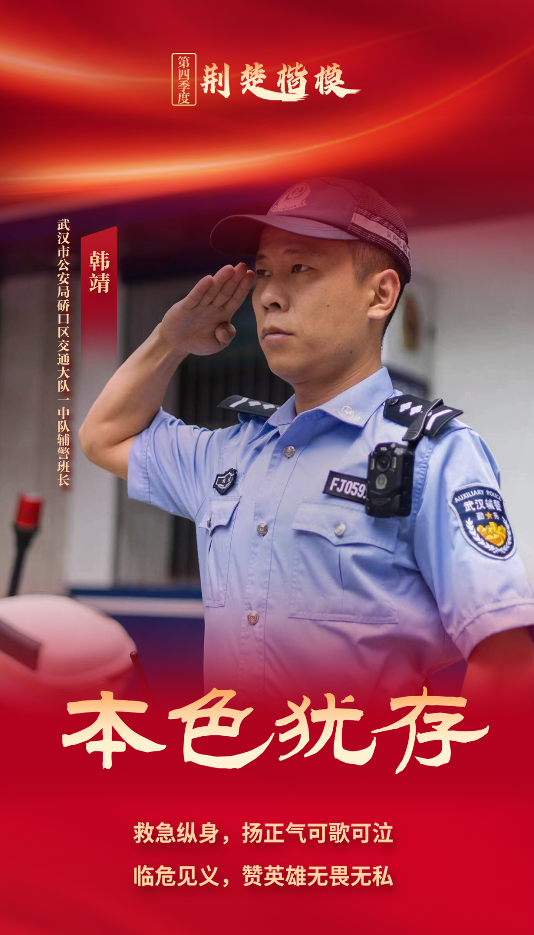 见义勇为跳桥救人的退伍军人。韩靖曾是一名特种兵。2019年3月到硚口区交通大队工作以来,他立足平凡岗位,热心服务群众。2023年7月28日凌晨5时,月湖桥上一女子跳江,他毫不犹豫从近30米高的桥上纵身一跃,游江近百米,拼尽全身力气将其救起。救人事迹被新华社、人民网、中国警察网等多家媒体报道,在社会上引起强烈反响。被中央政法委评为“2023年第三季度见义勇为勇士”,获评“武汉楷模”。