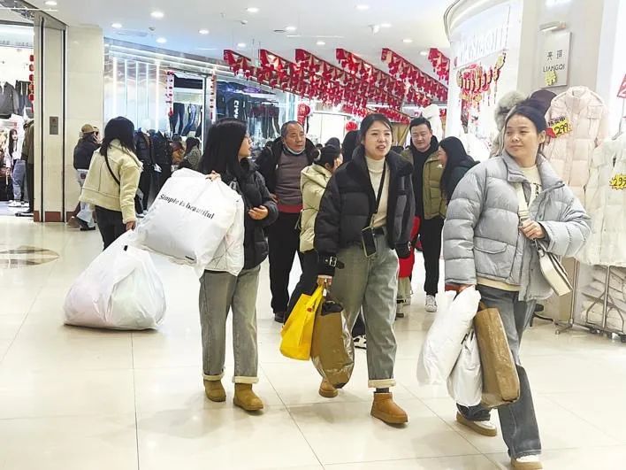 商户也纷纷推出促销活动。不少店铺门口牌子上标注了“打底衫50元”“裤子100元2条”“全场5折”等字样,收银台前已经排起长队,购物的人群络绎不绝。一位销售人员介绍,新年“战袍”从现在开始基本就进入了旺季。