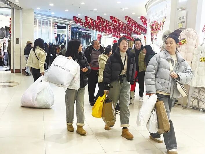 拎着大包小包的顾客摩肩接踵,一些商户摊位之间的过道上,顾客更是要侧着身才能通过。“羽绒服全场299元,特别划算啊。”正在门口招呼顾客的一位商铺老板被人流挤进了柜台内。