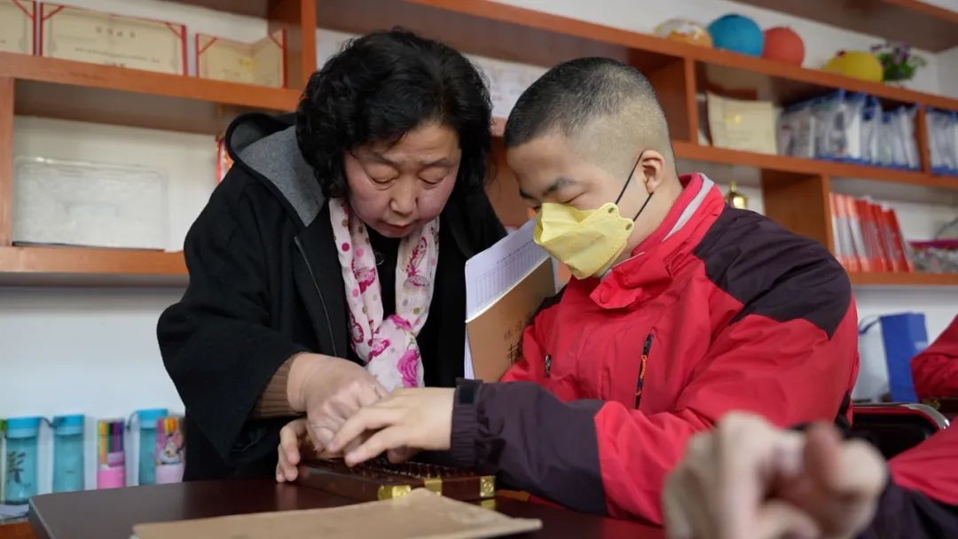▲“阳光家园”珠心算老师孙莉教学员们用算盘计数