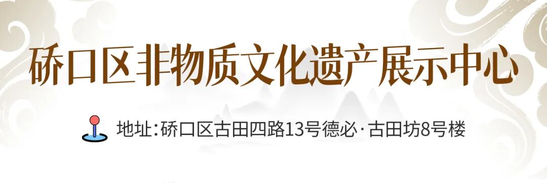 非遗展示厅:重点介绍我区24个非物质文化遗产项目,展示中心设立龙从发工作室(武汉木雕船模)、苏峰工作室(苏恒泰油纸伞制作技艺)、刘义桥工作室(叶画)。