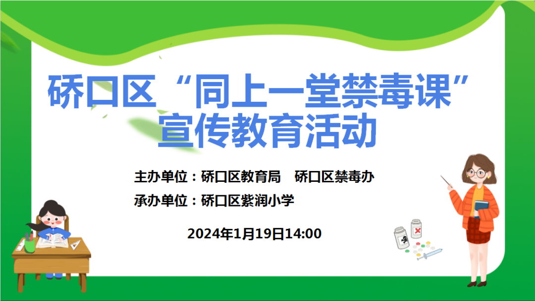 为深入贯彻落实习近平总书记关于禁毒工作“要坚持关口前移、预防为先,重点针对青少年等群体,深入开展毒品预防宣传教育”的重要指示精神,落实国家、省、市、区禁毒工作部署要求,硚口区教育局将联合硚口区禁毒办于1月19日下午2:00举行“全区中小学生同上一节禁毒课”直播。届时将在硚口发布同步直播活动实况,敬请观看!