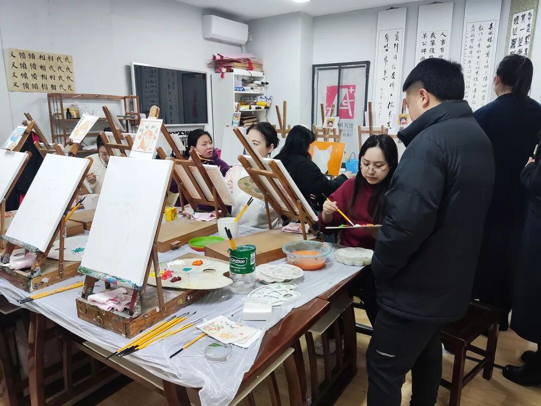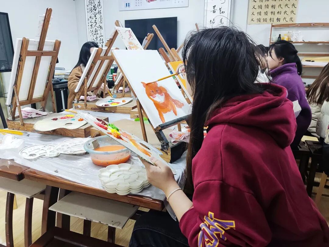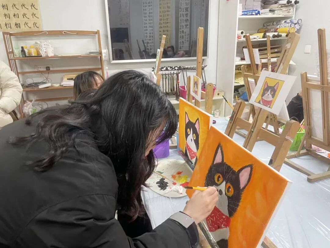 不大的教室内,近20幅画架摆放得满满当当,学员们坐在画布前,手拿画笔跃跃欲试,时不时有老师指导提点,不知不觉间,一幅幅油画作品已创作完成。