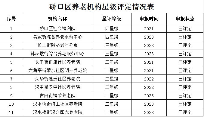 据了解,截止目前,硚口区获省级评定4级养老机构2家,3级养老机构2家,获市级评定2级养老院7家。