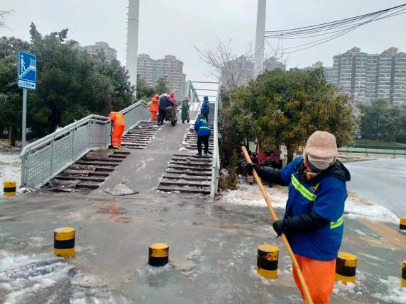 武胜路高架桥、新墩立交、长丰高架等桥梁硚口地段,已撒融雪剂并铺设了防滑草垫,桥面无积雪结冰;