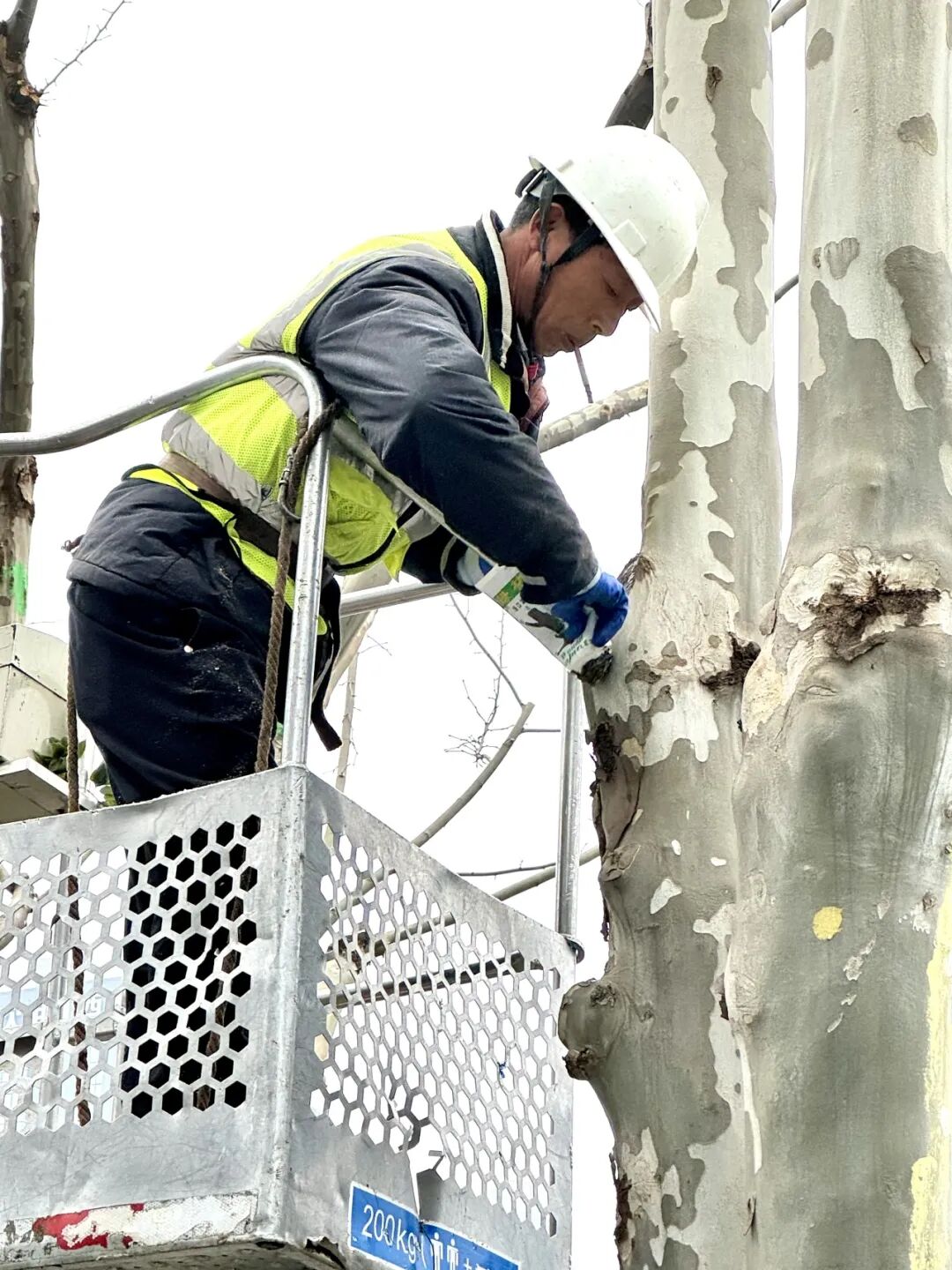 随着园林高空作业车缓缓升起,行道树修剪作业开始,伴随着连续的油锯声,绿化养护师傅迅速将大树上不需要留下的侧枝修剪干净,并用专业的药剂涂抹大树伤口。大约半个小时,一棵大树就被修剪完成。