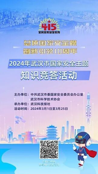 4月15日是第九个全民国家安全教育日。为全面宣传贯彻总体国家安全观,不断增强全民国家安全意识和素养,营造浓厚的国家安全宣传学习氛围,由中共武汉市委国家安全委员会办公室、武汉市科学技术协会主办,武汉科技报社承办的2024年武汉市国家安全主题知识竞答活动将于3月1日正式启动。