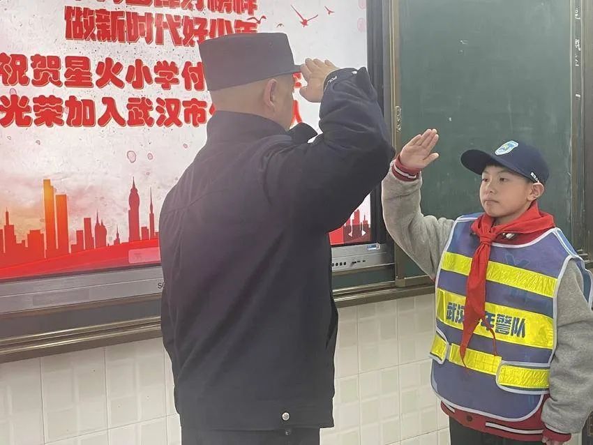 近日,硚口区星火小学五年级3班教室里,硚口区公安分局民警向拾金不昧的付梓航同学提出表扬,同时邀请他加入武汉少年警队。