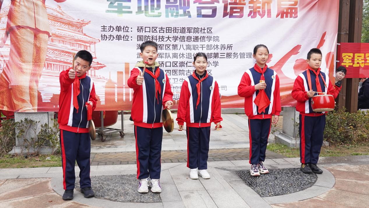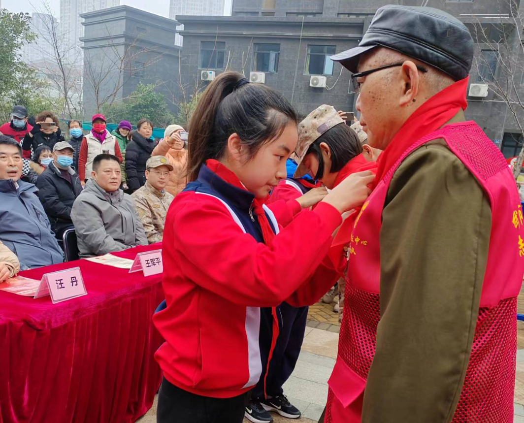 橄榄绿牵手红领巾,奋斗正当时。活动从国防科技大学学员刘福落的从军卫国历程锵锵分享拉开序幕。他表示,雷锋精神的生命力感召力,在于雷锋是一代又一代人共同“学”出来的榜样,雷锋精神从来不是刻板的教条、空洞的陈词,而是人人可学、处处可为,真真切切、实实在在。军休干部赵南行教授用朴实亲切的语言、鲜活生动的自身革命传统教育奋斗经历娓娓道来,把微党课宣讲将讲台搬到居民“家门口”。新时代年轻官兵与传统老革命呼应,为大家展现了中国军队建设的跨越发展。“大手拉小手”行动由国防科大15名官兵及武汉今天梦想商贸有限公司的代表向崇仁汉滨小学30名优秀小学生定向结对捐赠书籍和笔记本,鼓励学生们认真学习,树立理想,不忘时代的嘱托。少先队员们为官兵、军休干部佩戴上红领巾,并致以崇高的敬礼,那抹红是红领巾的国旗红,飘扬在胸前永不褪色,寓意着强国小少年,践行继承雷锋精神,争做新时代“小雷锋”。随后,精彩的演出纷至上演,崇仁滨江小学学生代表及军院社区工作人员分别带来禁毒三句半和廉洁家风小快板,将禁毒与廉洁家风理念唱入人心,筑牢安全底线。当熟悉的旋律再次唱响,所有人的目光都注视前方,聆听着“学习雷锋好榜样,忠于革命忠于党......”,场面庄严而隆重。通过“大手拉小手”行动的开展传承了红色基因,弘扬革命精神,奏响了军民一家亲的动人乐章。