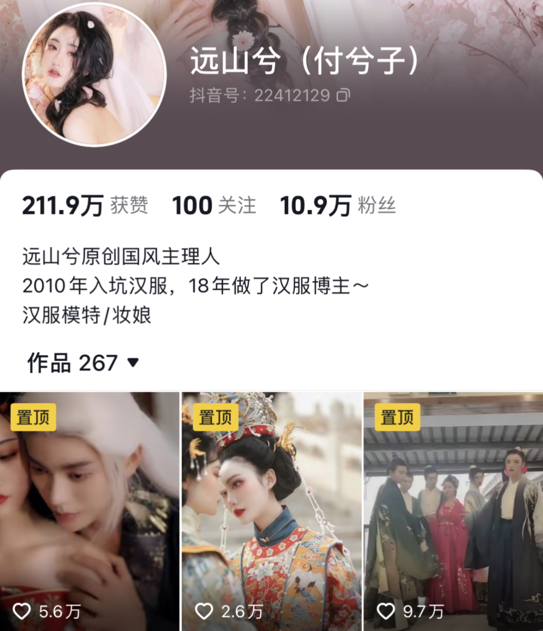 抖音@远山兮(付兮子),汉服品牌“远山兮”主理人、芒果TV “乘风破浪的姐姐”节目汉服走秀嘉宾,2021敦煌文化服饰宣传大使。