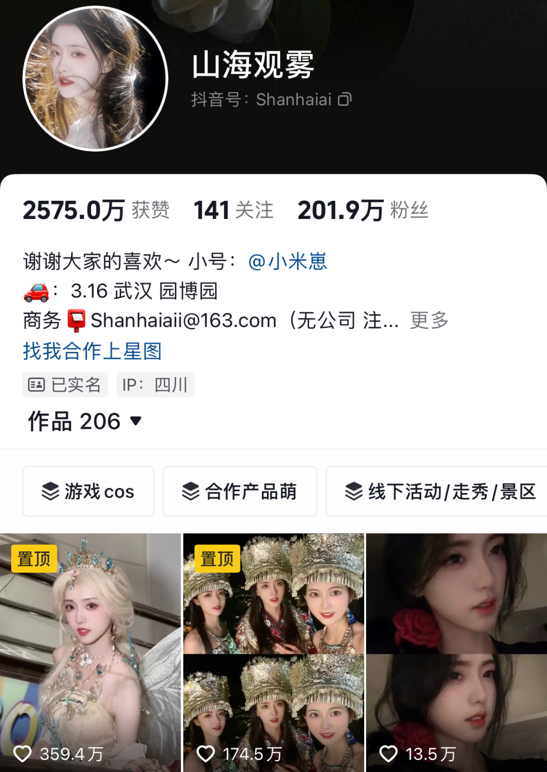 抖音@山海观雾 201.9万粉,知名古风博主,多次参与国⻛⼤典、华服⽇、华裳九州、⻄塘汉服⽂化周等活动。