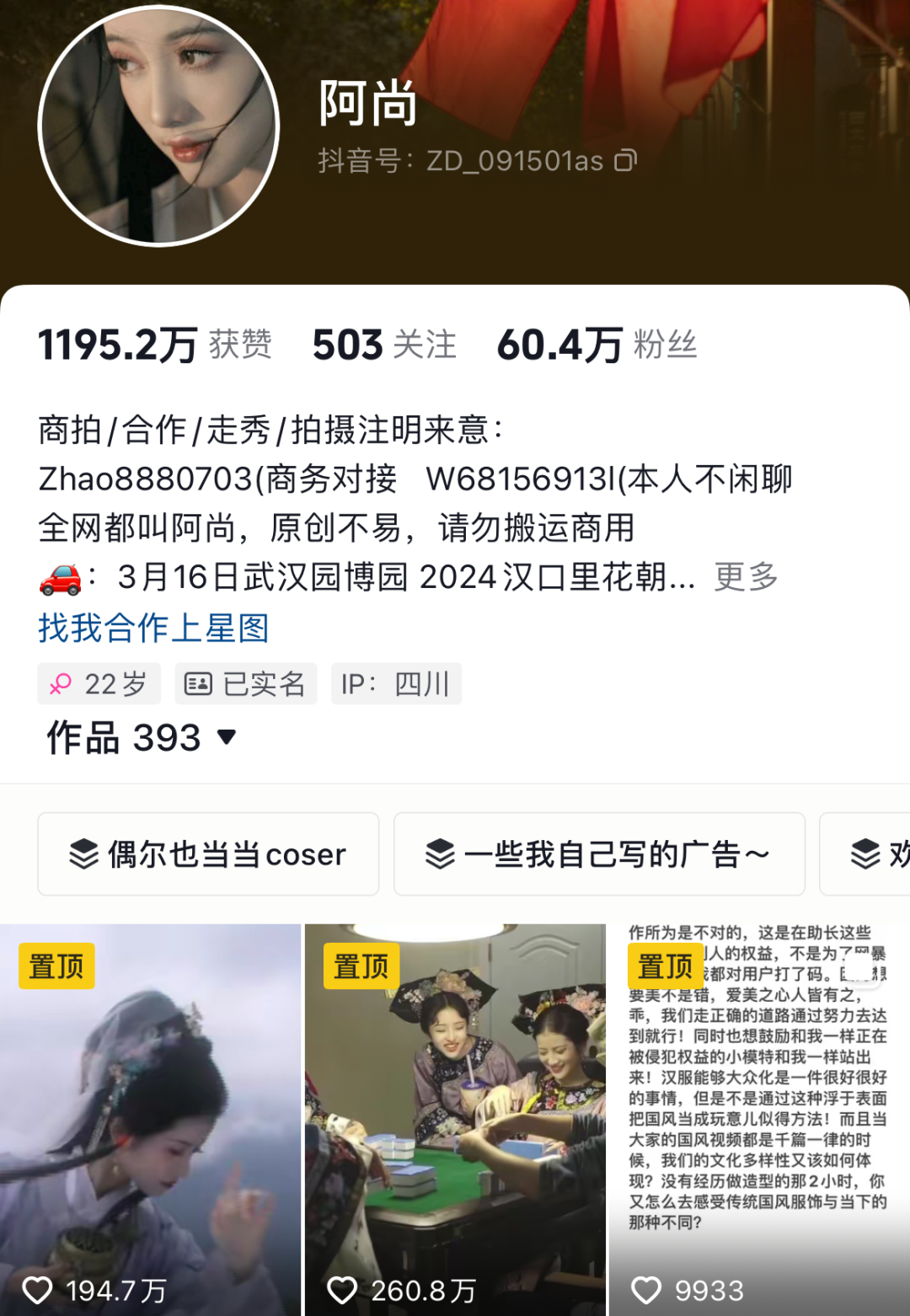 抖音@阿尚 60.4万粉,知名古风博主,其复原古早经典剧集角色形神具似。