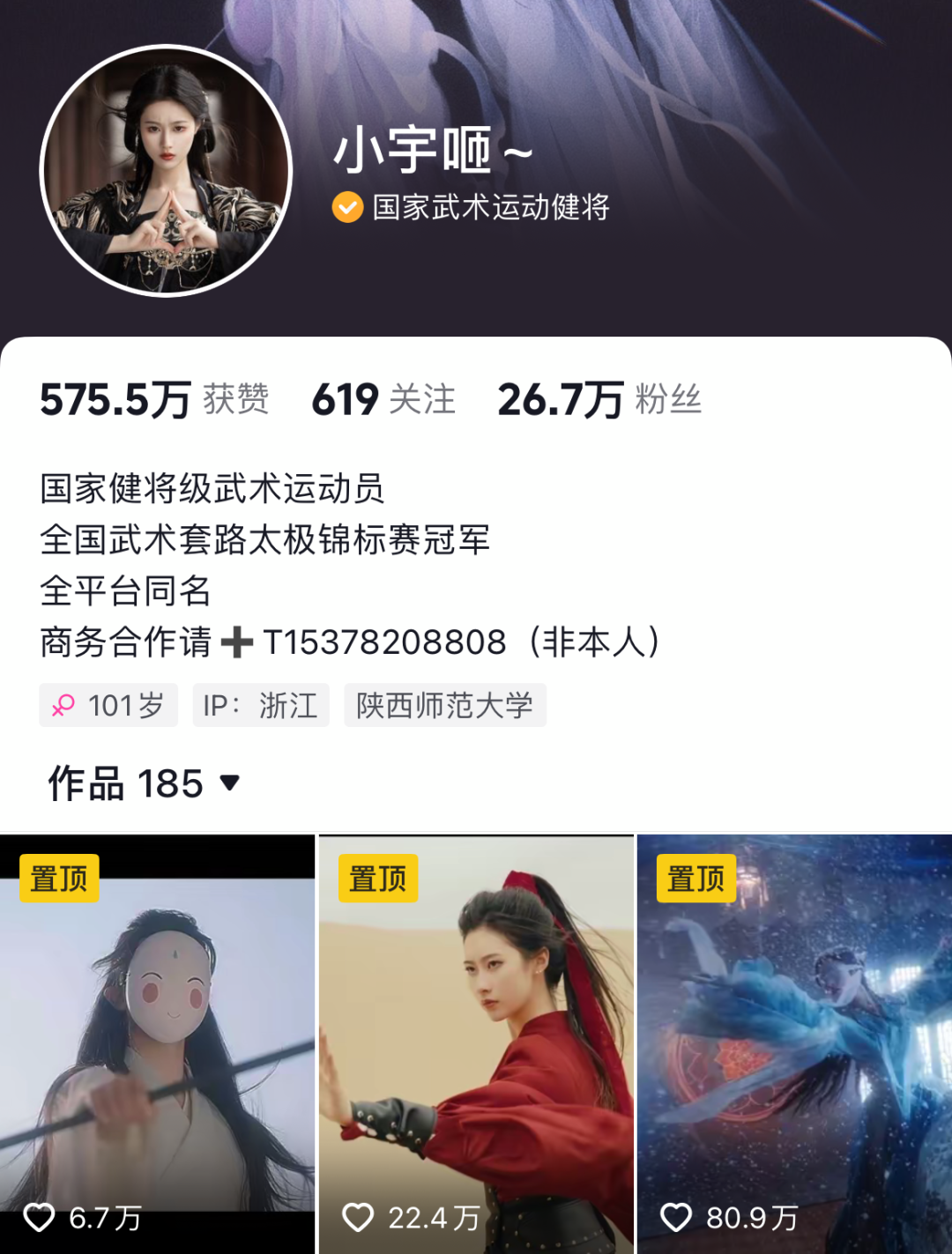 抖音@小宇咂 26.7万粉,国家健将级武术运动员、全国武术套路太极锦标赛冠军、古风博主。