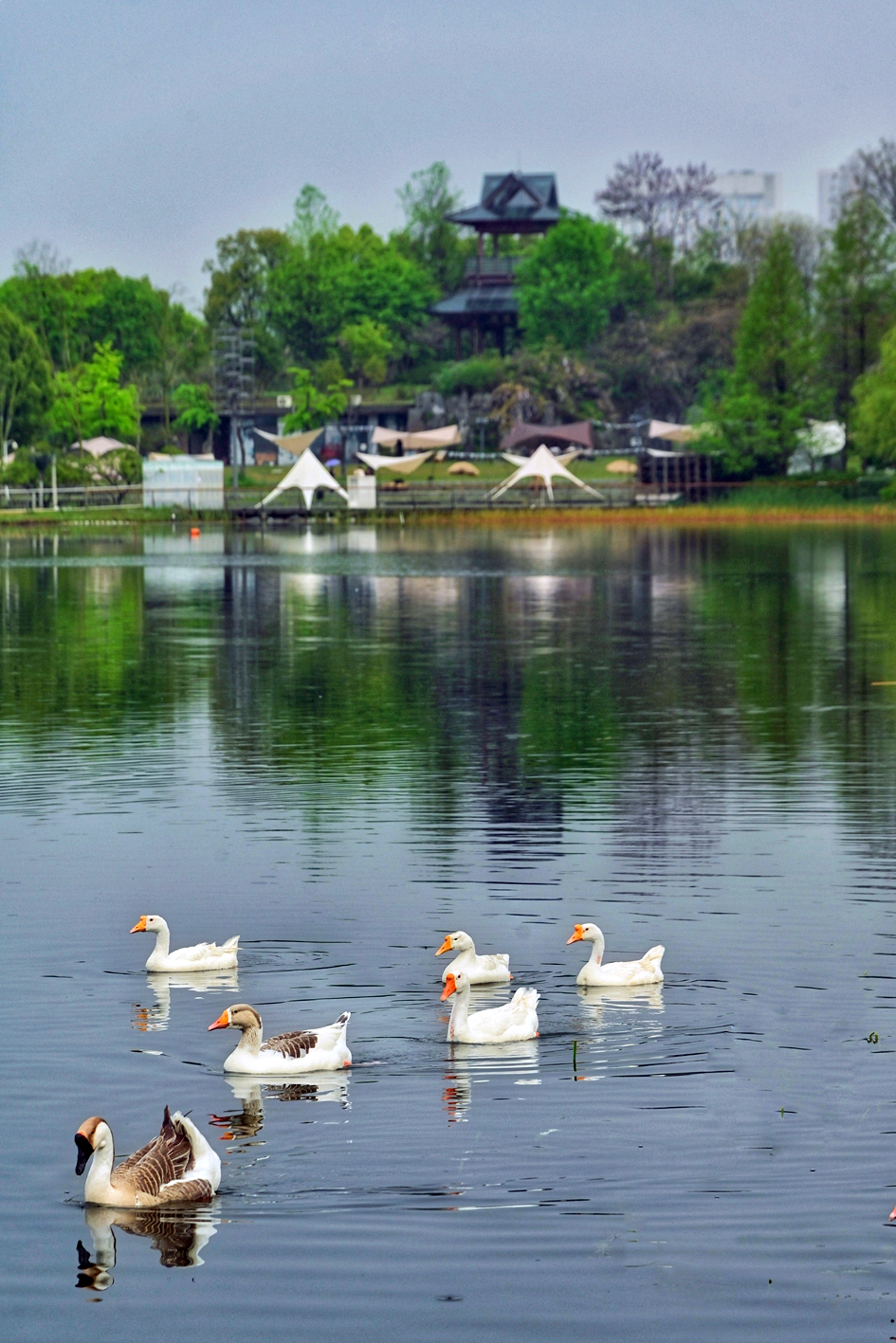 碧波荡漾,鱼翔浅底,绿草如茵。鸭子成群结队,悠闲地在水中游荡。美景、花箱、鸟鸣,尽显春日的活力与希望。