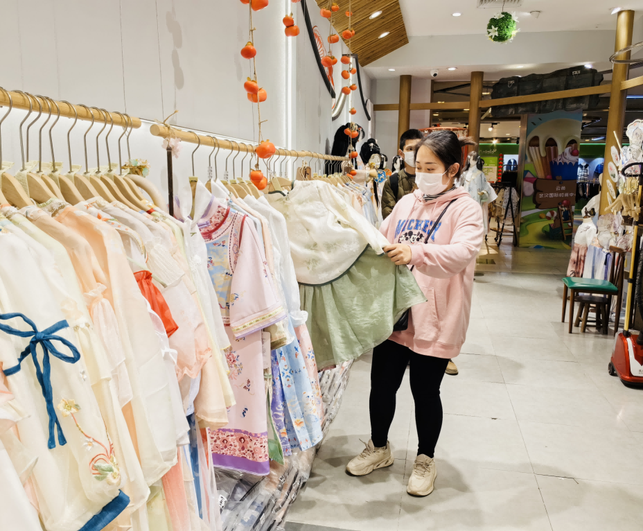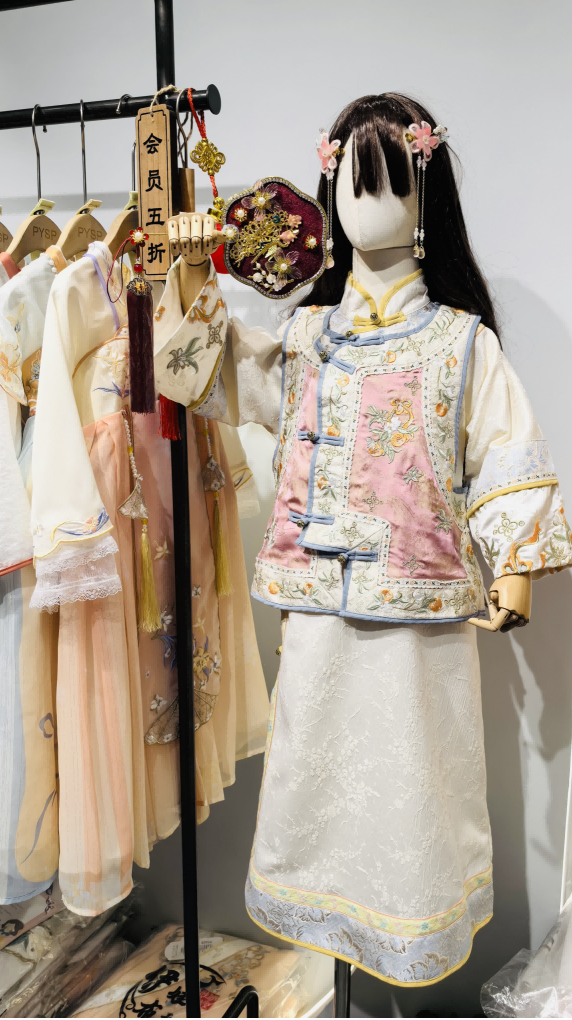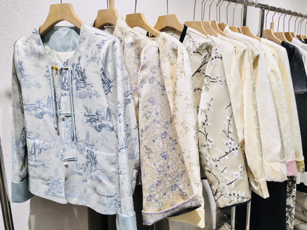 云尚二楼的一家新中式女装店内,陈列着宋锦马甲、流苏衬衫、盘扣外套等最近流行的新中式服装,一件看似普通的外套,运用了盘扣、刺绣等国风元素,凸显了东方意趣和审美,尽显优雅和精致感。