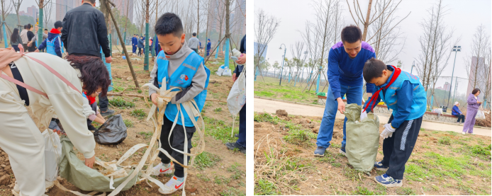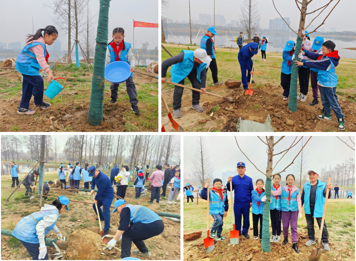 随后,在消防指战员的带领下,红领巾小小河湖长以小组为单位开展了植树活动。队员们与消防员齐心协力,体验了挖土、扶苗、回填、浇水等植树环节,一株株新苗迎风挺立,传递着生机与活力。