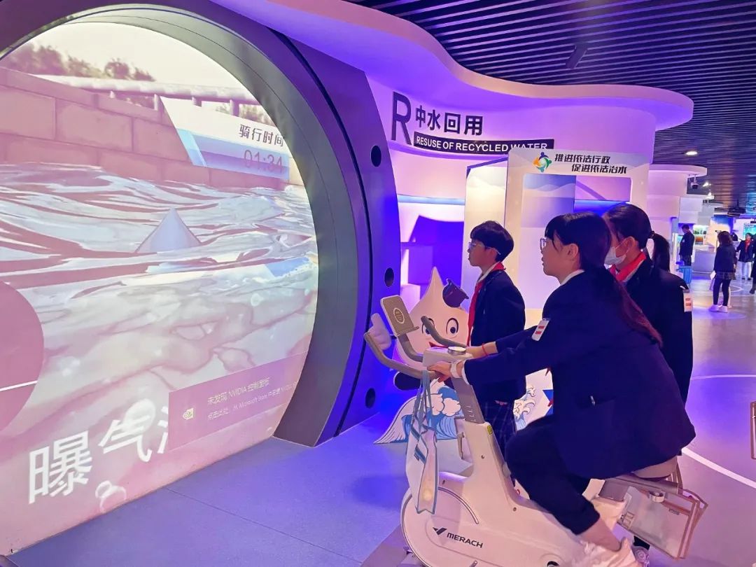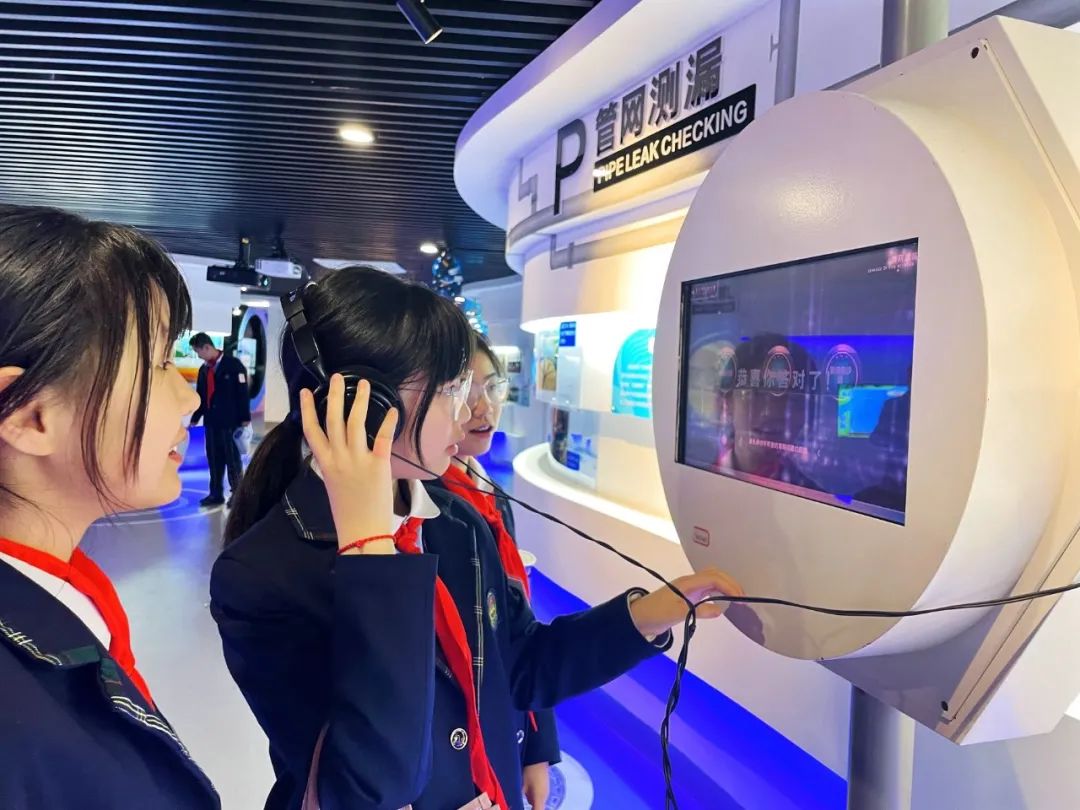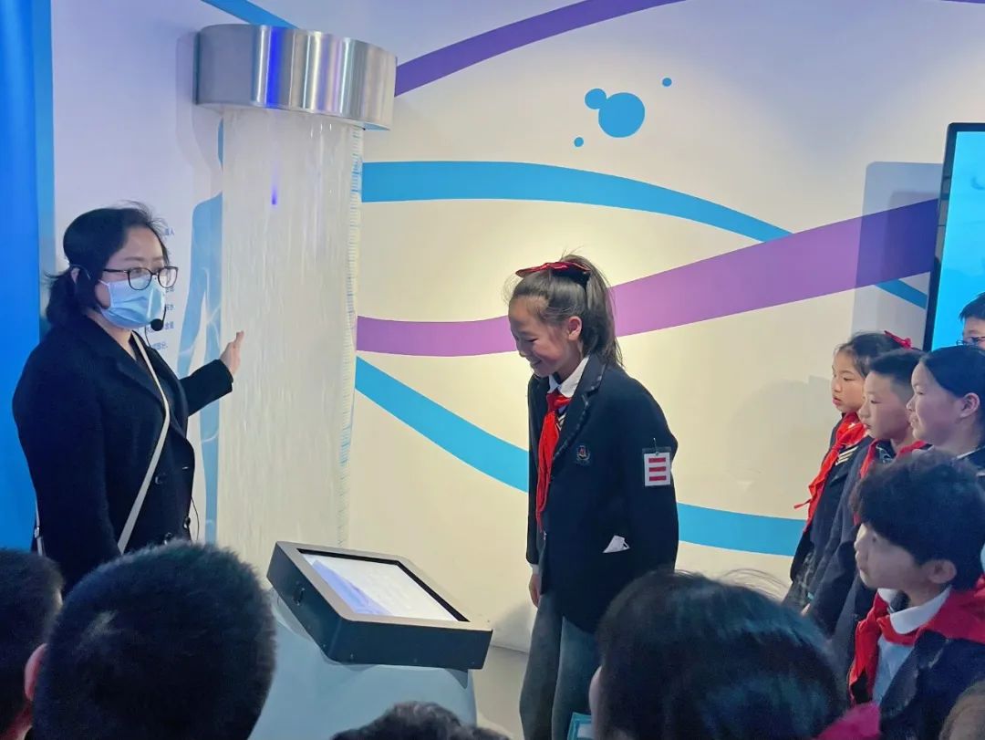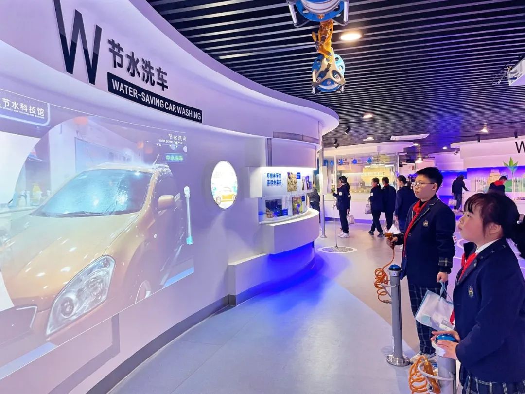 “如何检测地下管网侧漏?”“你知道无水也能洗车吗?”在科技馆二期互动体验馆内,队员们通过立体影像技术、模型演示、人机互动等多种方式了解了节水知识、节水技术,在水幕写字、骑车净水、模拟洗车、检测漏水等互动体验中真切感受节水科技成果,进一步唤醒节水意识。