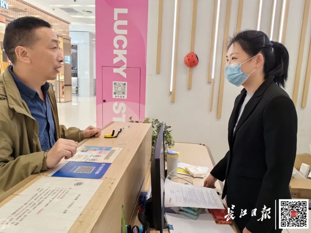 市民万先生在商场服务台咨询夜间优惠共享停车月卡办理。