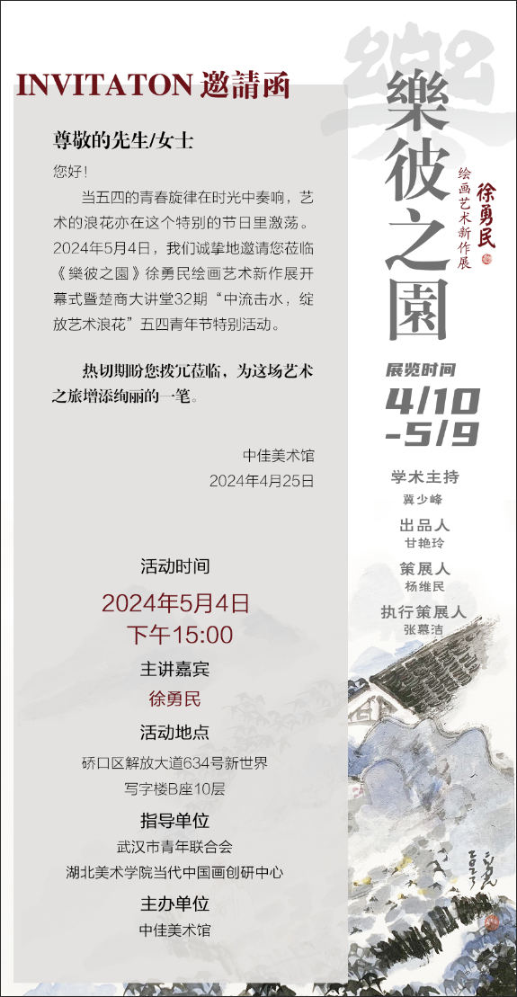 2024年5月4日,《樂彼之園》徐勇民绘画艺术新作展开幕式暨楚商大讲堂32期“中流击水,绽放艺术浪花”五四青年节特别活动正式开展,欢迎各位带着热情带着想象前来参与,为这场艺术之旅增添绚丽的一笔。