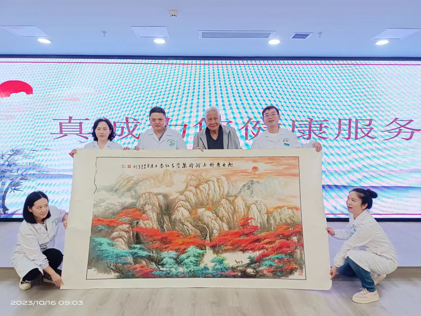 杨先生身体好转后,将自己创作的一幅山水画送到韩家中心表示感谢。