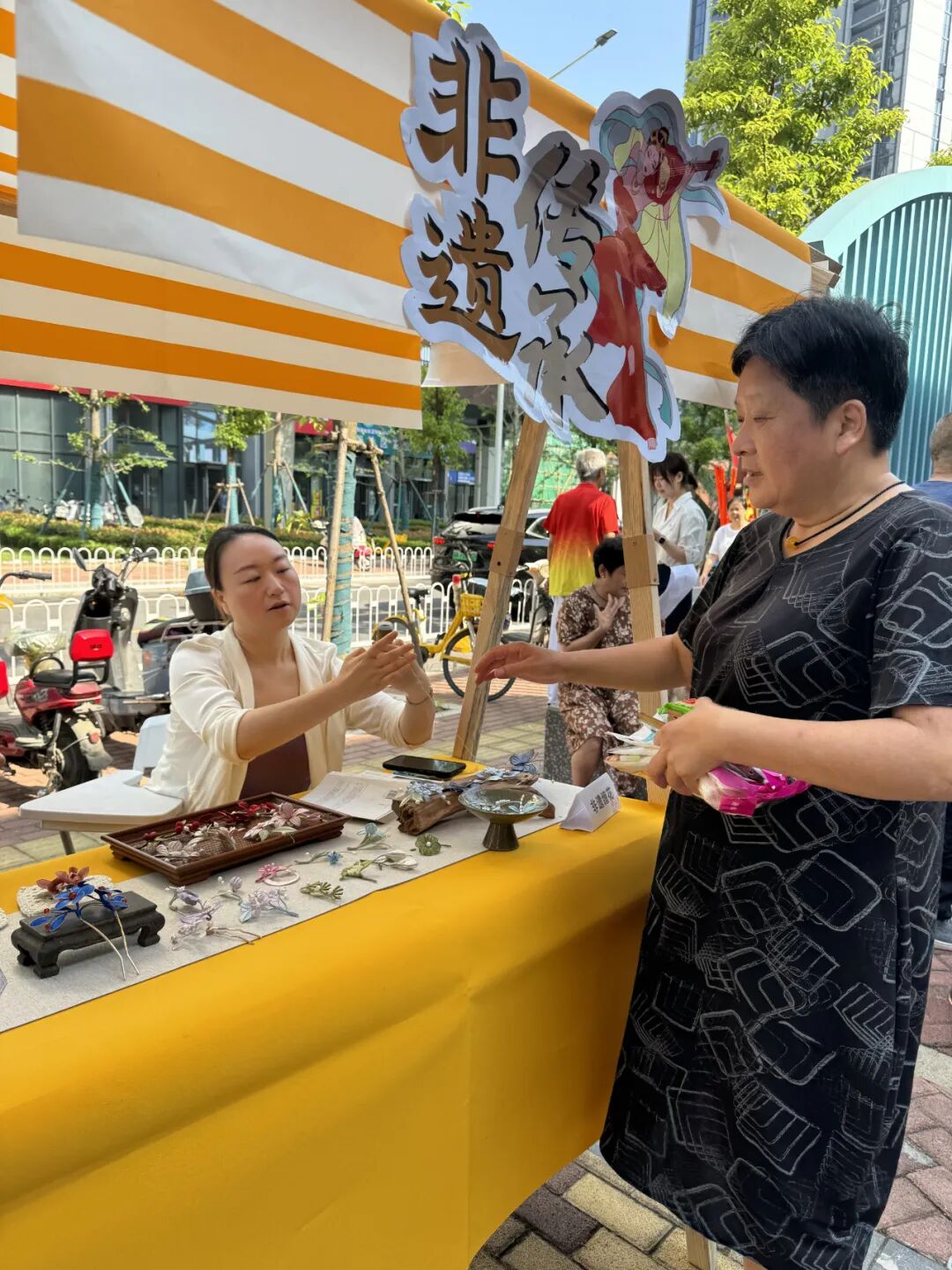 非遗技艺漂漆体验摊位前更是人流如潮。居民先选好自己喜欢的颜色,在老师的协助下,将色漆滴入水中轻微搅拌,水面瞬间形成流动的花纹。然后,将白色扇面缓缓放入水中,或平铺或旋转,让大漆附着在扇面上。最后,就是惊喜时分啦!一幅颇具中式意境的漂漆扇便脱水而出。大家围在一起,互相欣赏对方的配色,期待着每一个扇面出水的瞬间。