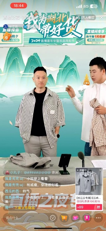 “面料做了立体纹路,手感非常柔软,夏天很透气,上身好百搭,这款衬衣不管怎么穿搭都好看!”直播间里杨威带货湖北特色产品,为荆楚品牌助力,为网友介绍并试穿展示了一款短袖格子衬衣,正是来自云尚优选汉派男装依王品牌设计生产的服装。