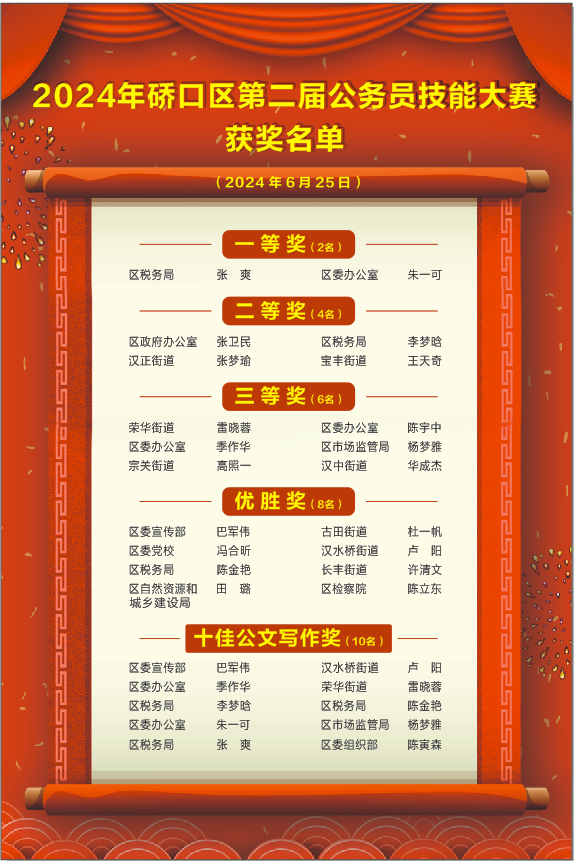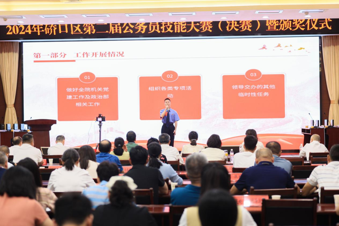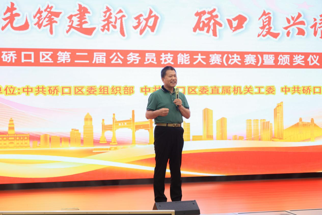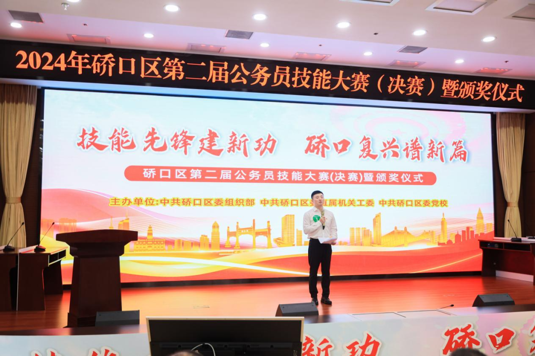 为隆重庆祝中国共产党成立103周年,深入学习贯彻习近平新时代中国特色社会主义思想,着力推进“五型”模范机关建设,提升全区公务员履职能力,激发立足岗位建功立业的热情,为加快硚口复兴、重塑硚口辉煌提供有力保障,6月25日,在“七一”建党节前夕,由区委组织部、区委直属机关工委、区委党校联合主办的2024年硚口区第二届公务员技能大赛决赛暨颁奖仪式在区机关会议中心举行。