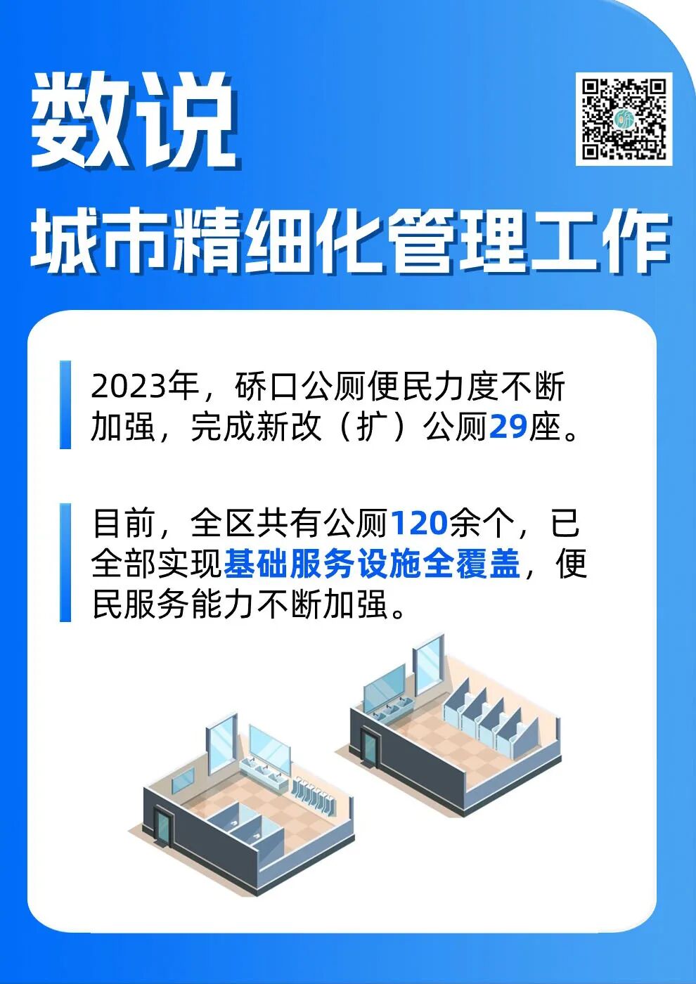 在家千日好,出门一时难。我们在收集意见的时候,很多市民都反映公厕有找厕难和难下脚两个问题,所以为了让方便更方便,公厕硬件外观大气时尚、内里明媚透亮、偶有微风穿堂,管理更标准、更智慧、更人性,一直是我们进行‘厕所革命’的目标。”