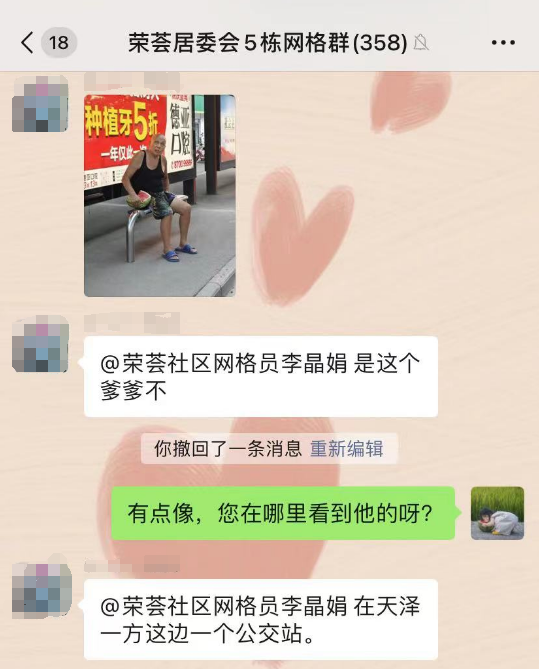 原来,看到社区网格员在微信群内发布的照片后,家住广电兰亭翠园的李女士就留了份“心眼”,观察起周围的落单老人,终于在天泽一方小区旁的公交站发现了线索。