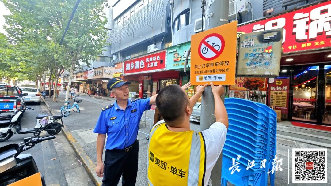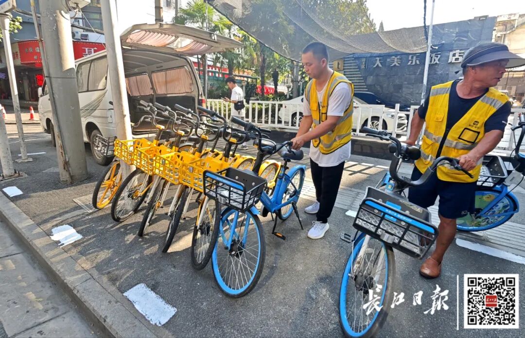 在此巡查的六角亭街道公管办负责人吴智丹介绍,这条街上,每到用餐高峰时段,共享单车在此集中停放。六角亭街道还有地铁站、商圈、医院等点位会在不同时段发生单车扎堆现象。
