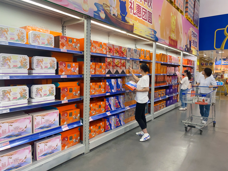 作为月饼界的“老网红”,美心月饼年年都是“断货王”。在硚口的麦德龙门店,美心月饼的货架被摆在了醒目的位置,有流心奶黄月饼、流心四式月饼、双黄白莲蓉等多种经典口味供顾客选择。