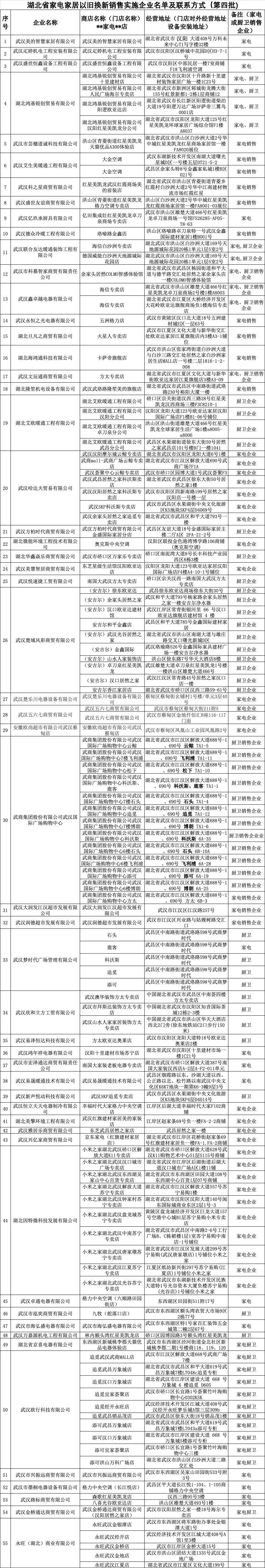 8月30日,湖北省商务厅公布了我省家电家居以旧换新销售实施企业第四批名单,武汉有55家企业121家门店入选。