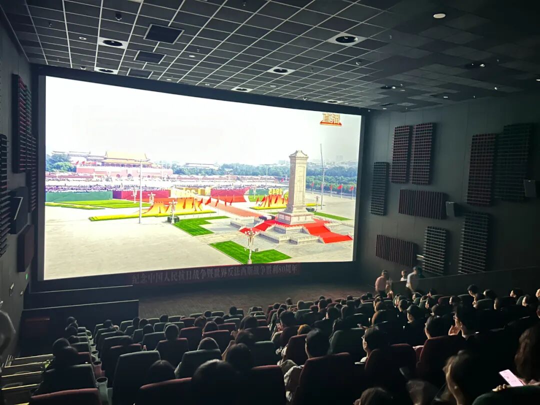 硚口区的党员干部与群众走进武汉恒隆广场电影院,观看阅兵直播,现场氛围热烈浓厚,爱国情感满溢!