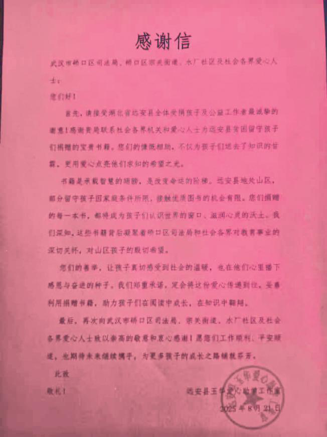 8月20日,经宗关司法所依法批准,J某带着第二批图书踏上回乡之路。为了让更多家乡贫困孩子能读到好书,J某与司法所商议后,决定将这批书籍捐给远安玉华爱心助学工作室。如今,这些书籍已在远安悄然“扎根”,成为孩子们课余时光的温馨驿站。“你们捐赠的每一本书,都是孩子们认识世界的窗口、滋润心灵的沃土。”这封感谢信,不仅见证了J某与宗关街道居民为远安孩子筑起的知识之桥,也成为社区矫正工作润物无声、助人新生的生动写照。