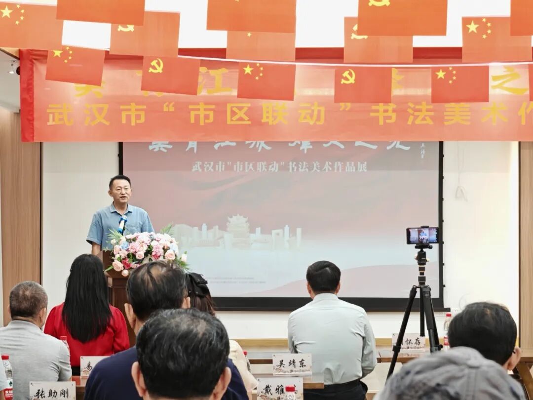 开幕式嘉宾云集。武汉市群众艺术馆、各区文旅局、文化馆领导及多位书画艺术界名家莅临现场,共同见证这一文化盛事。硚口区文化和旅游局副局长张翔致欢迎辞,参展作者代表郭鹏分享创作心得,湖北柏岭科技集团有限公司领导致辞,武汉市群众艺术馆党委书记、馆长胡怀存宣布展览正式开幕。现场气氛热烈庄重,与会者满怀期待,沉浸于这场艺术盛宴。