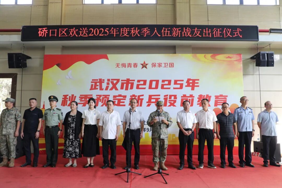 参军报国、无上光荣。9月15日,武汉市硚口区2025年下半年入伍新兵欢送仪式在武汉野战国防园新兵役前教育基地隆重举行,区委常委、区人武部部长陈登胧、区政府副区长朱红兵及各街道、高校征兵工作负责人、新兵家长参加仪式。